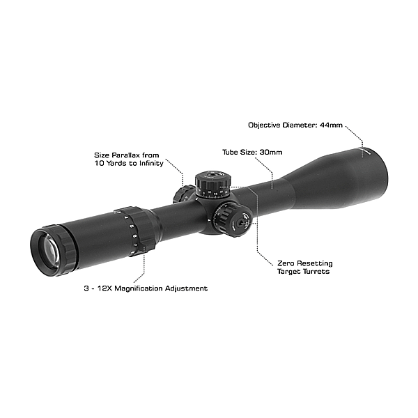 Artículo: 24764 Modelo: SCP3-3124EAOW Campo de Visión: 34 pies (10,2 mts) Largo: 326 mm Ajuste de paralaje: 10 yardas a infinito Retículo: Mil-Dot