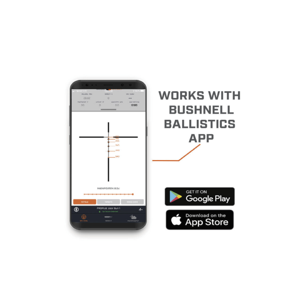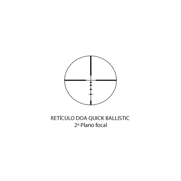 El Retículo DOA QUICK BALLISTIC, en segundo plano focal, proporciona 5 puntos de caída con líneas de retención de viento de 5 mph. Se puede utilizar para cualquier calibre que coincida con los cartuchos de caza típicos hasta 500 yardas. Con la APP gratuita «Bushnell Ballistics», puede determinar rápidamente sus distancias exactas en el retículo, lo que le permite tener confianza en cada disparo.