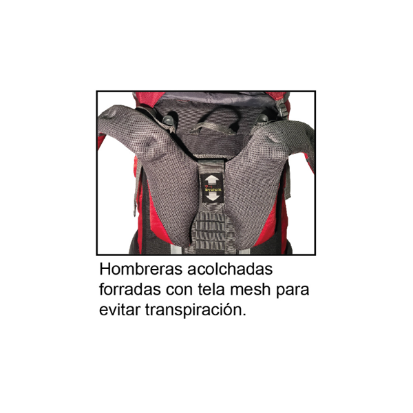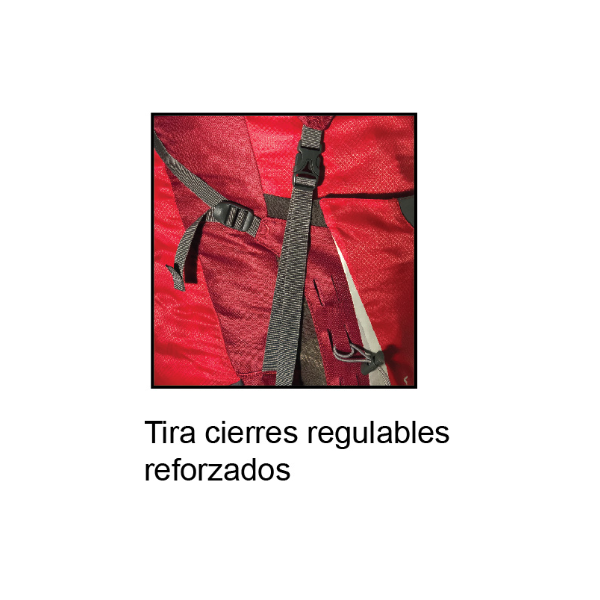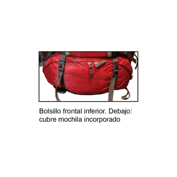 | -Tela: Polyester resistente rip stop anti desgarro con revestimiento de PU repelente al agua -El sistema V-1 se ajusta a la longitud de la espalda -Ajuste frontal para su mayor comodidad -Compartimento inferior para bolsa de dormir -Bolsillo frontal y bolsillo superior para ropa y accesorios -Ajuste para bastones de trekking -Bolsillo con cierre en el cinturón -Compatible con bolsa de Hidratación -Cubre mochila incorporado. |