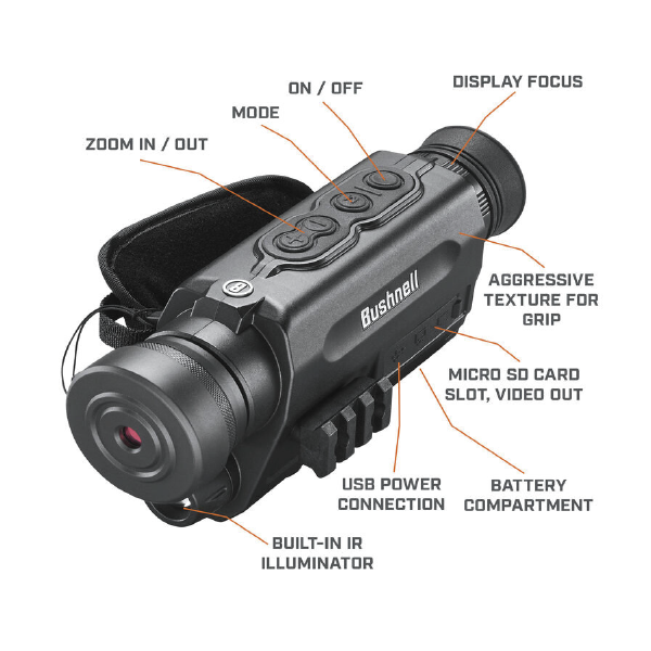 | -Monocular -Peso 391 g. -Zoom Digital 3X -Iluminador infrarrojo (IR) incorporado -Graba video -Ranura para tarjeta micro USB -Permite montar trípode |