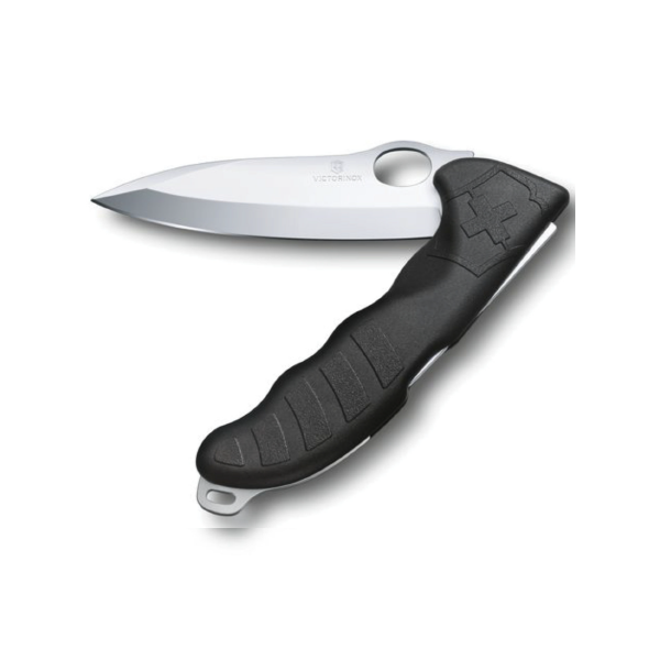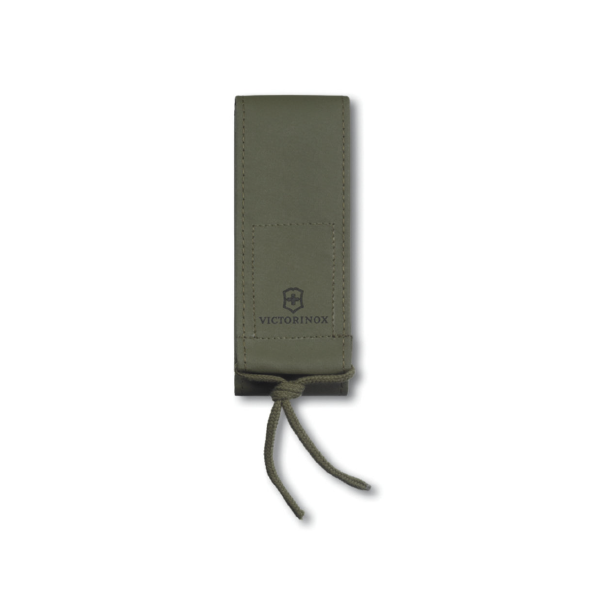 Hoja bloqueable, apertura con una mano, ojal de fijación y estuche sintético verde.