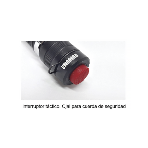 | Artículo: 27220 Modelo: BW 900RG -Construcción en aluminio grado aeronáutico -Interruptor táctico -Foco regulable -Ojal para cuerda de seguridad -Clip de acero, desmontable Modos 5: High/Medium/Low+ Strobe + SOS |