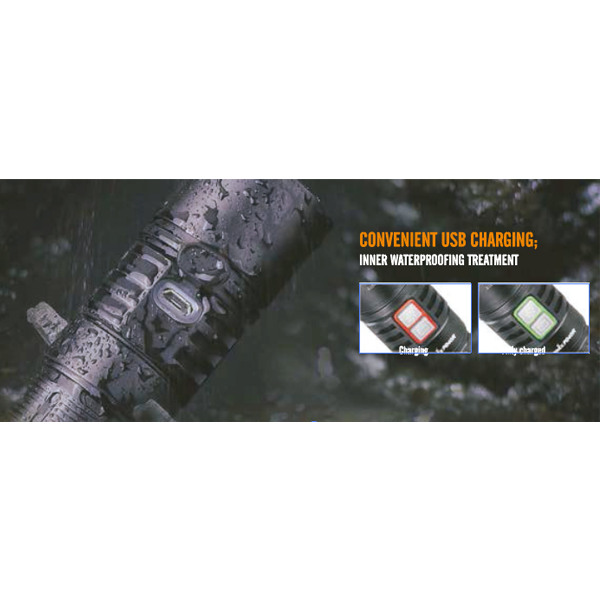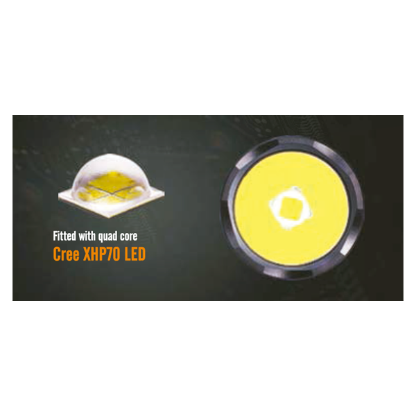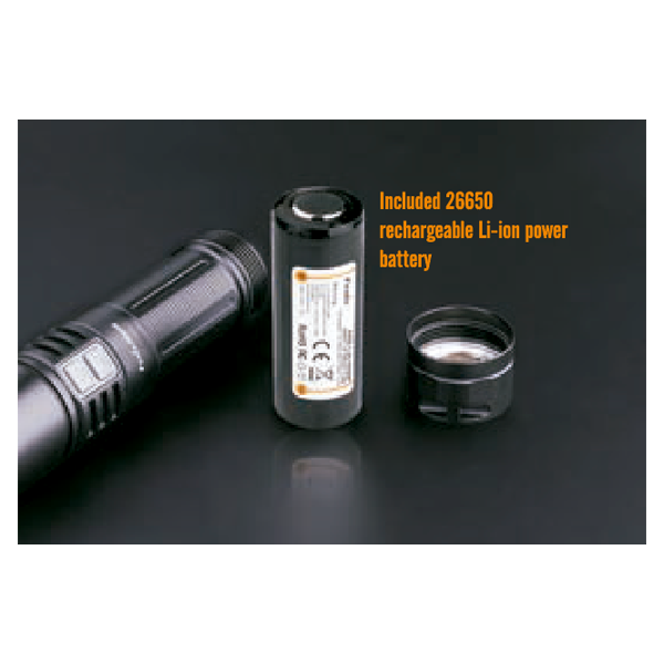 | -Fitted with quad core Cree XHP 70 LED -Included 26650 rechargeable Li-ion power battery -Micro USB rechargeable -Dual switch operation, lockout function -Battery level indication Artículo: 26500 |