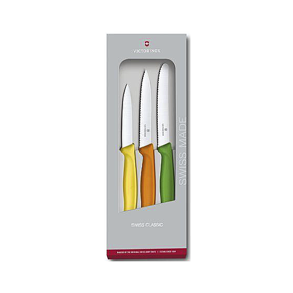 | Artículo: 22195 Modelo: 6.7116.31G SET DE CUCHILLOS PELADORES 3 PIEZAS Mango sintético de Polipropileno (PP) Incluye: Cuchillo para tomates, filo dentado, 11 cm, verde claro Cuchillo pelador, filo dentado, punta centrada, 10 cm, naranja Cuchillo pelador, punta centrada, 8 cm, amarillo |