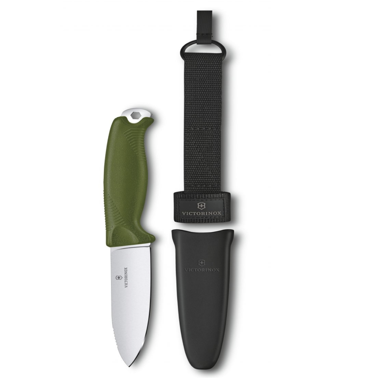 | Desarrollado por expertos en actividades al aire libre, cuenta con una hoja de punta en forma de gota para un tallado preciso, un lomo filoso en 90° para hacer fuego fácilmente y una funda protectora para hoja que sirve también como tubo de soplado para un encendido rápido. Cuchillo deportivo de espiga completa con funda para cinturón Mango antideslizante sintético con espiga sobresaliente y orificio hexagonal |