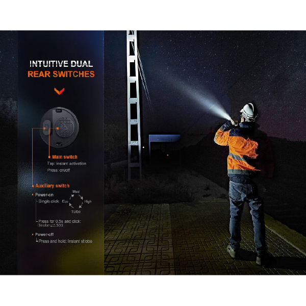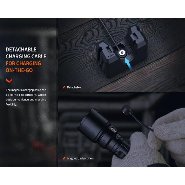 | -Magnetic charging cradle, can be separated with the magnetic charging cable. -Uses a Luminus SST70 LED with a lifespan of 50.000 hours. -Instant activation and instant strobe with dual tail switch. -Boot-up battery level indication and low-voltage warning. -Made of A6061-T6 aluminum. -Premium type HAIII hard-anodized anti-abrasive finish |
